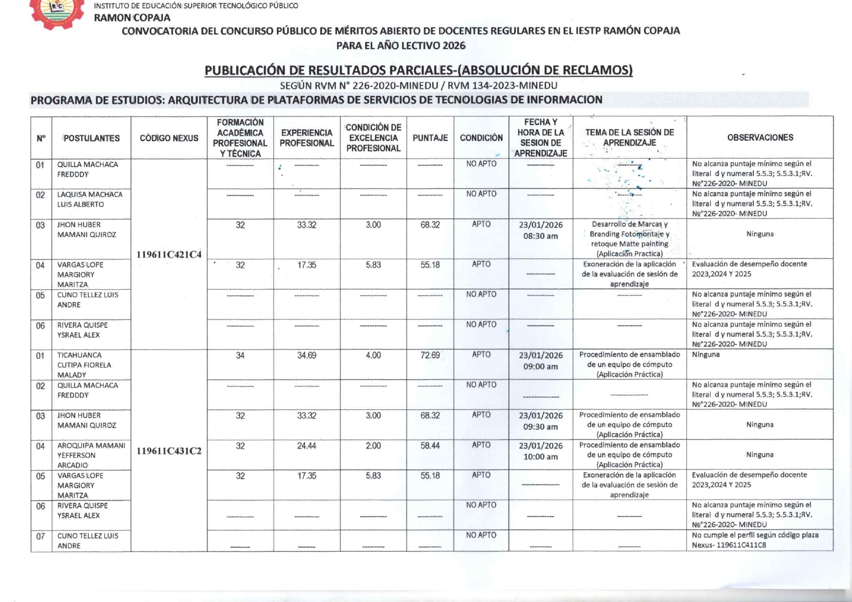 RESULTADOS PARCIALES (ABSOLUCION DE RECLAMOS) - CONVOCATORIA PARA EL CONCURSO PUBLICO DE MERITOS ABIERTO DE DOCENTES REGULARES IESTP RAMON COPAJA - 2026