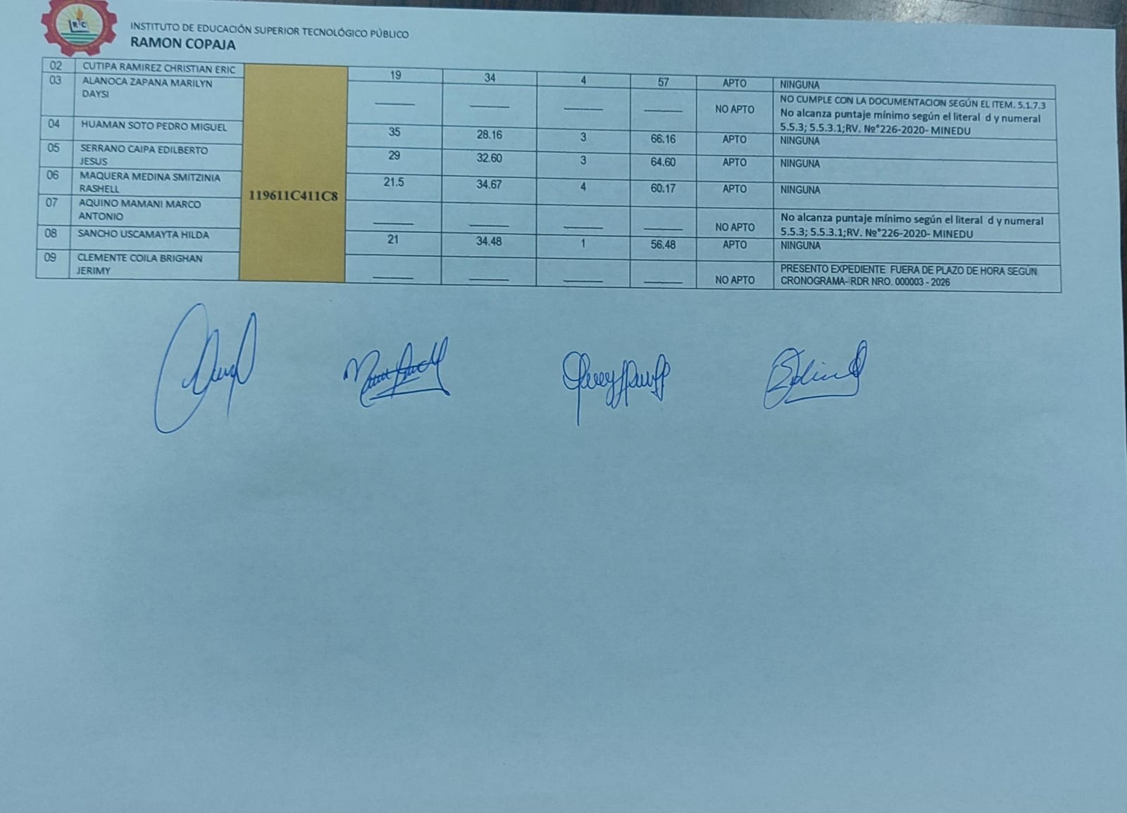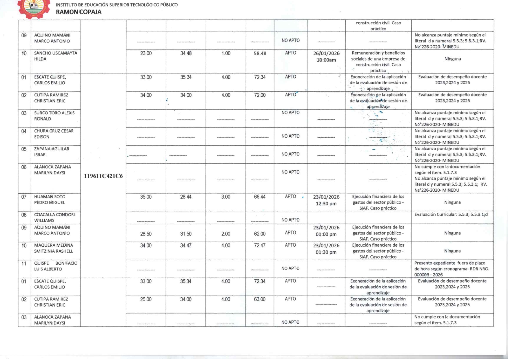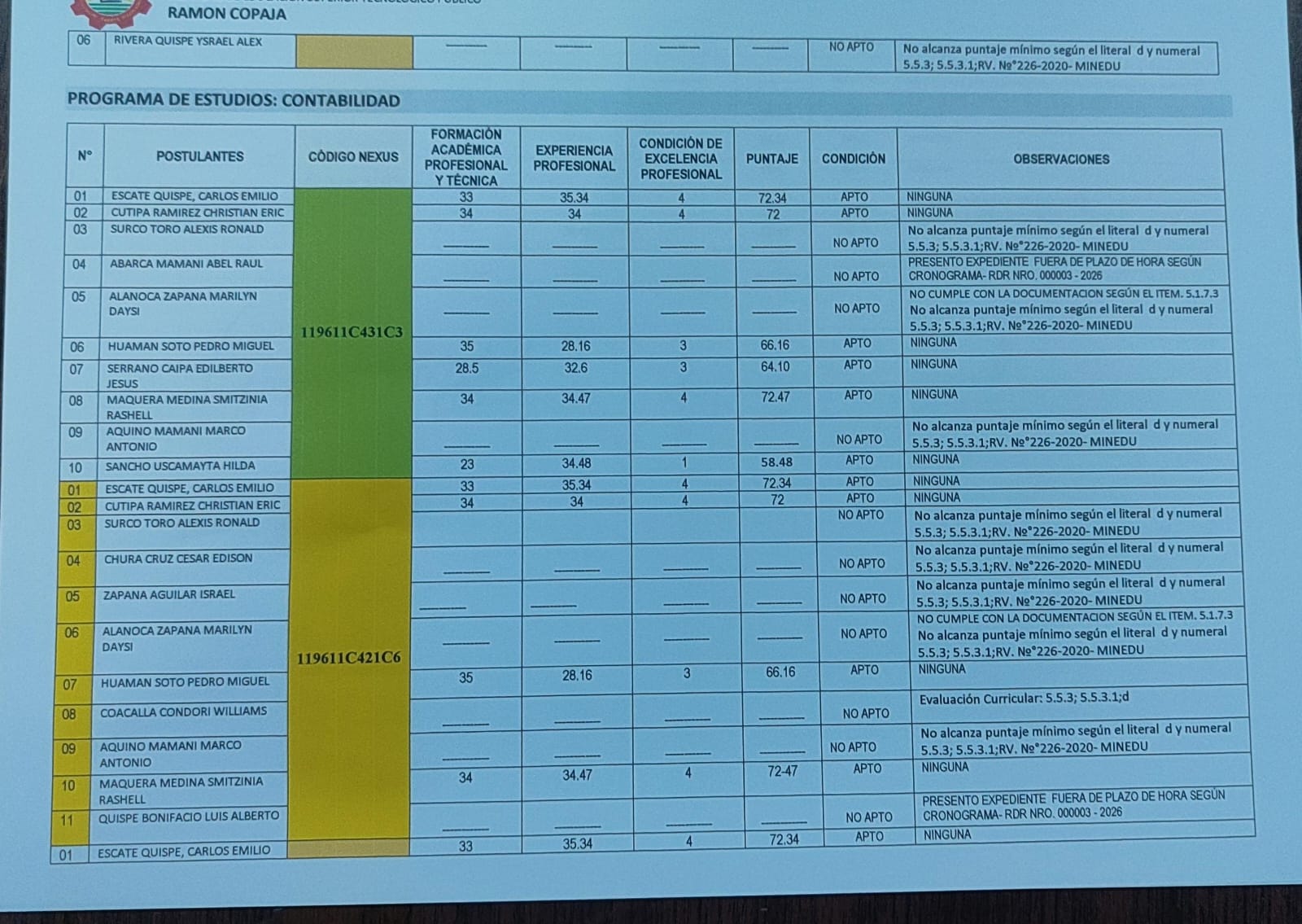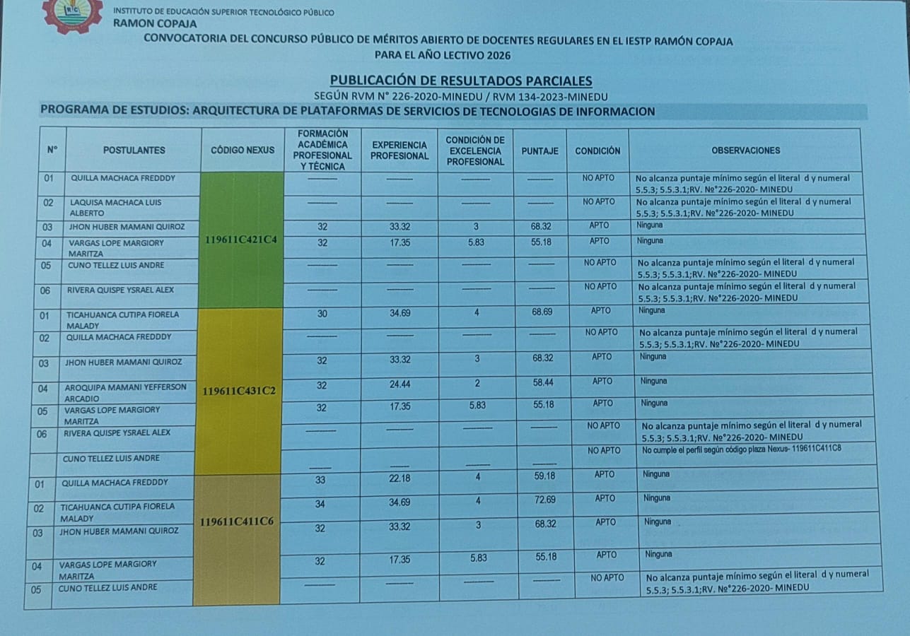 RESULTADOS PARCIALES - CONVOCATORIA PARA EL CONCURSO PUBLICO DE MERITOS ABIERTO DE DOCENTES REGULARES IESTP RAMON COPAJA - 2026